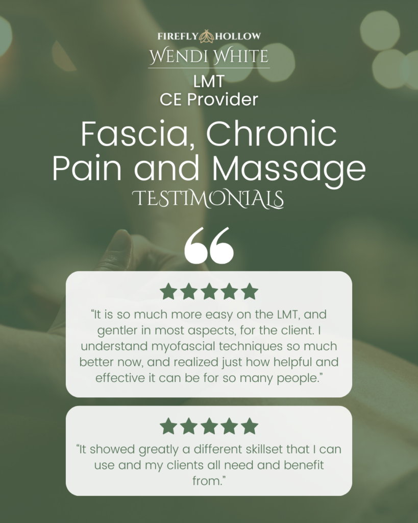 Join us for “Fascia, Chronic Pain and Massage (sign up here),” an NCBTMB Approved 8 CE course that will transform your practice.